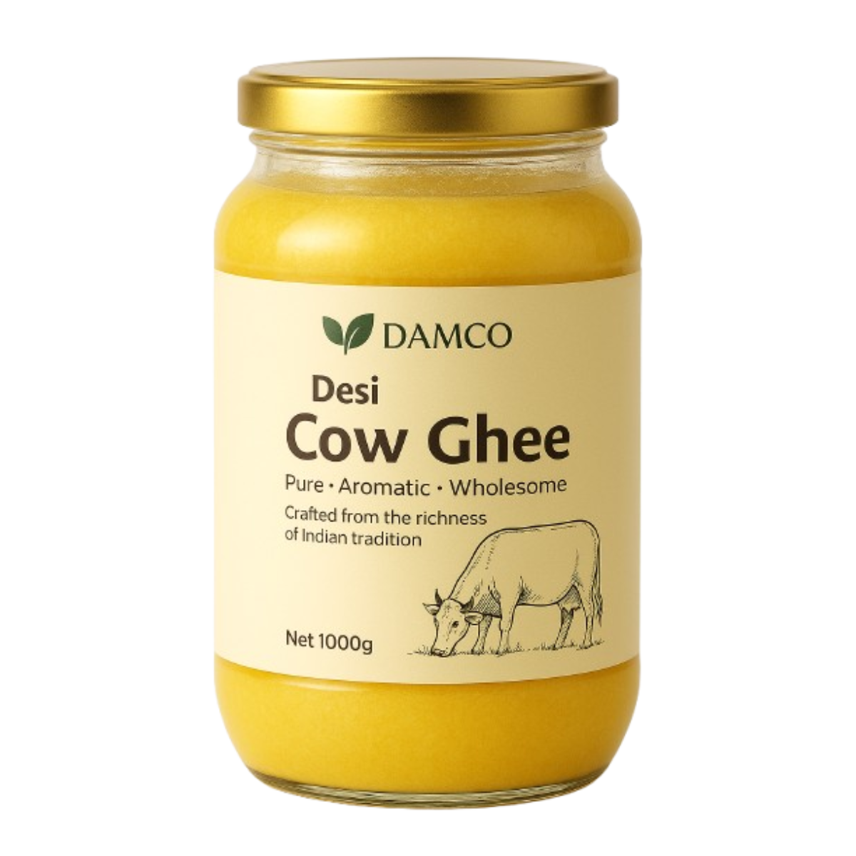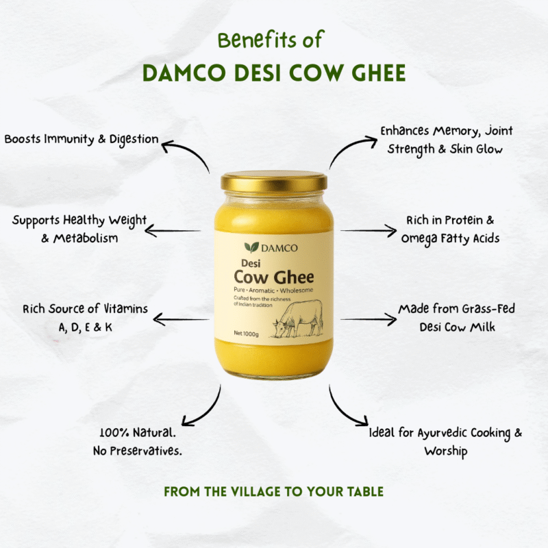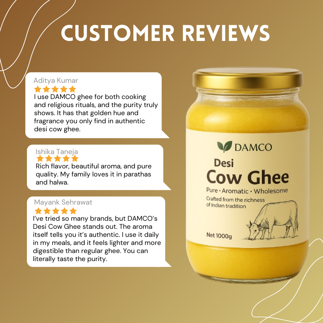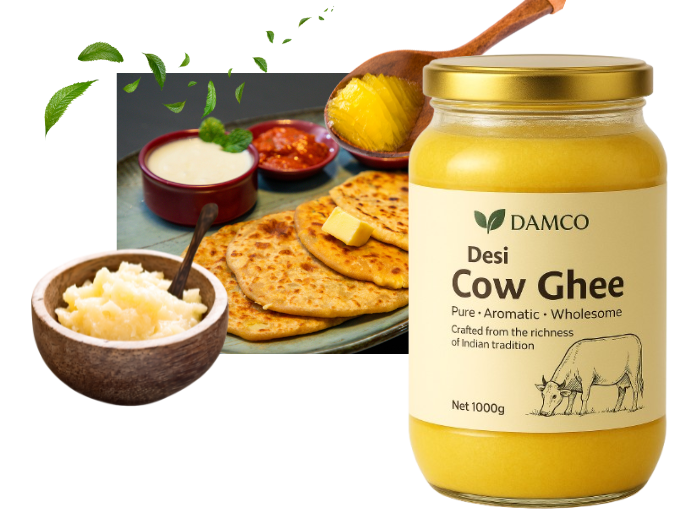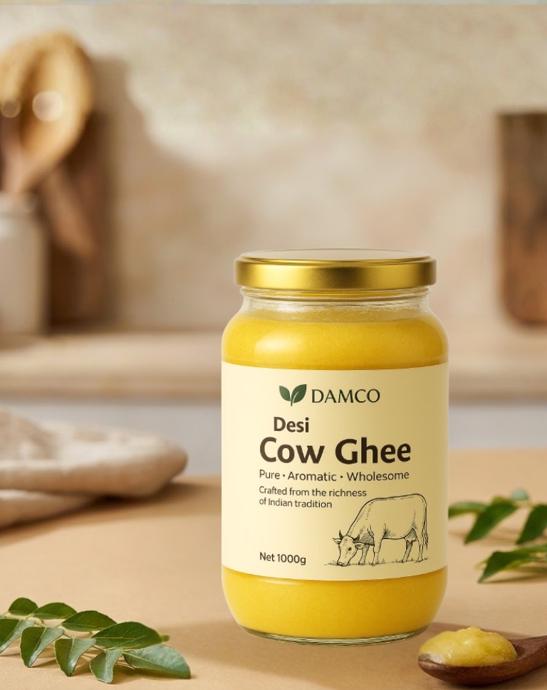 Crafted from the richness of Indian tradition, Damco Desi Cow Ghee is made using pure, farm-fresh milk and slow-cooked to perfection. Its golden color, rich aroma, and deep, wholesome flavor make it the ideal choice for cooking, wellness, and everyday nourishment.
