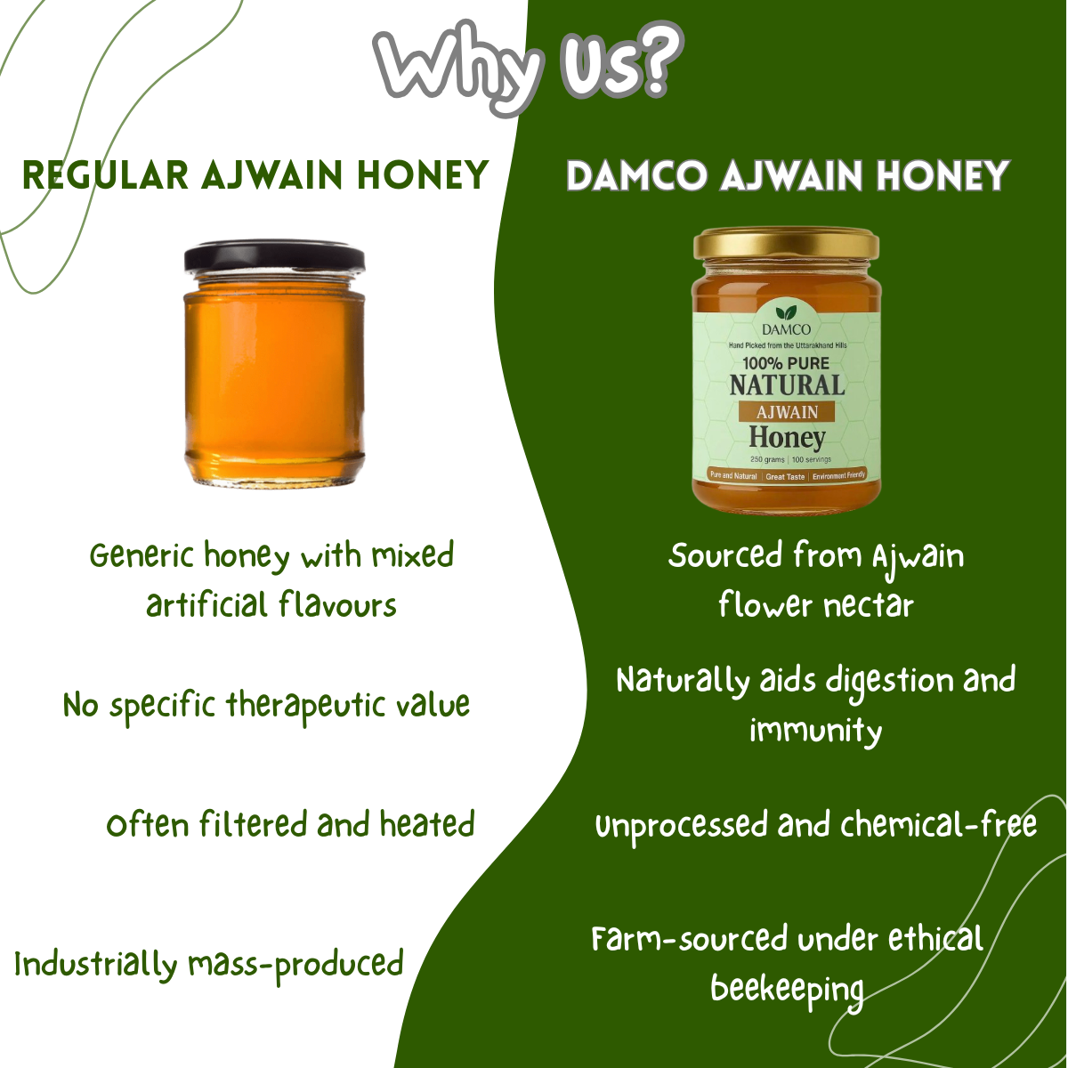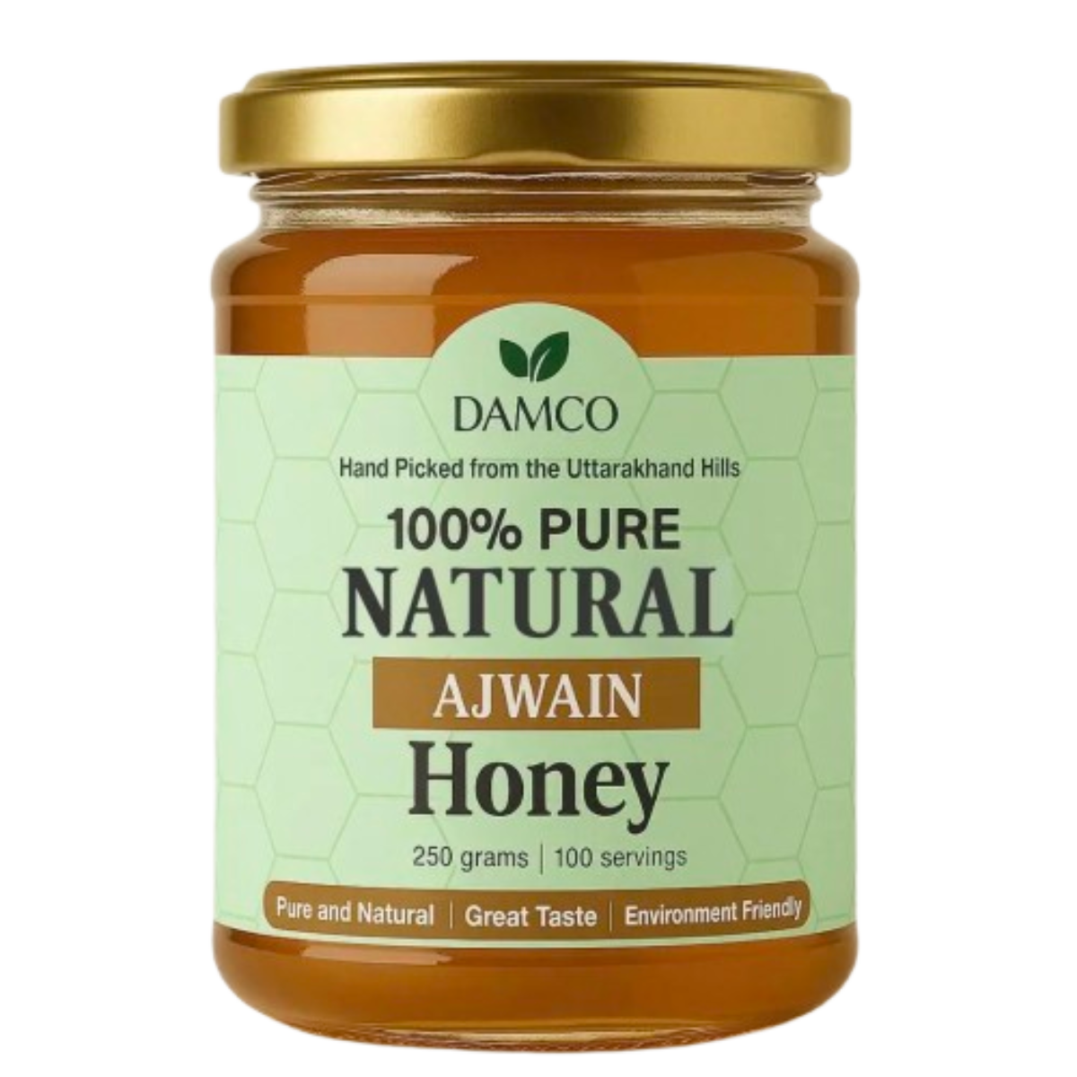Sourced from the aromatic Ajwain fields of Uttarakhand, DAMCO’s Ajwain Honey is a uniquely potent, raw nectar harvested during the brief flowering season of the Ajwain plant.