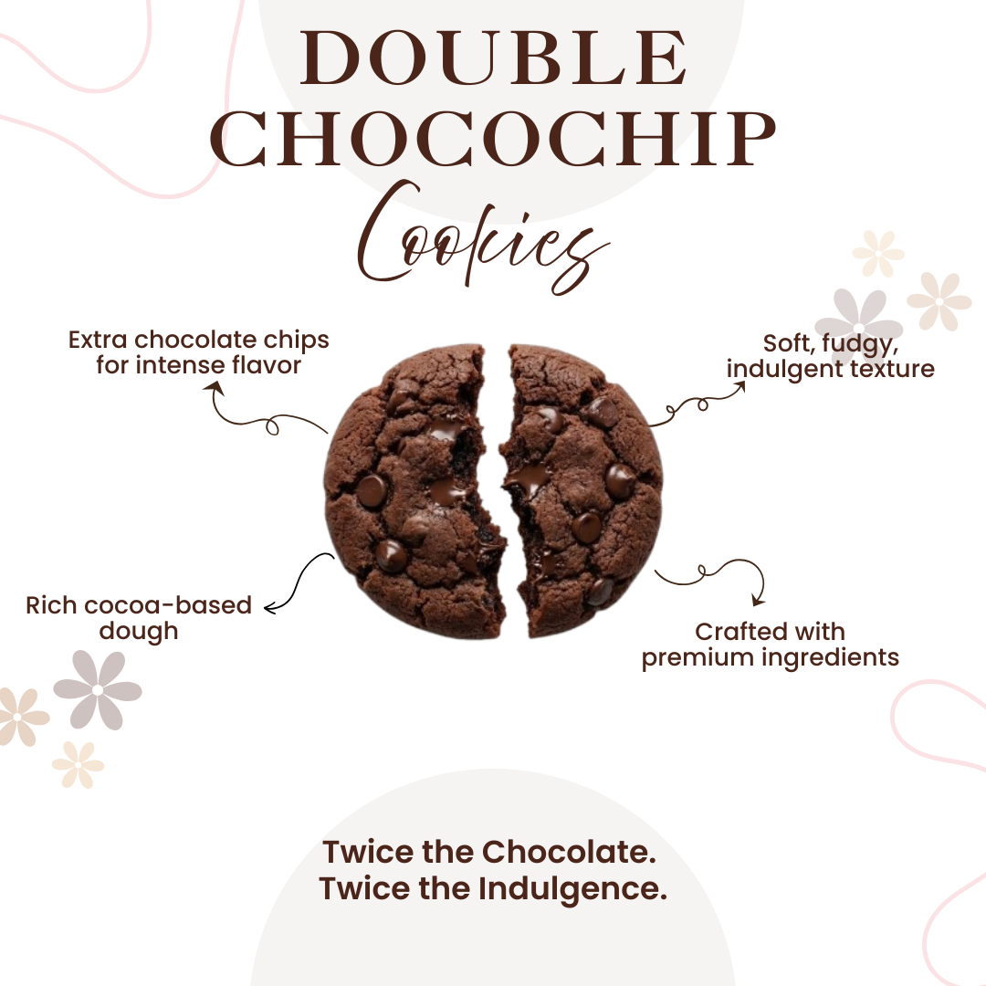 Experience the indulgence of rich and velvety Double Chocochip Cookies, baked to perfection with premium ingredients for a soft bite, bold flavor, and irresistible chocolaty goodness.